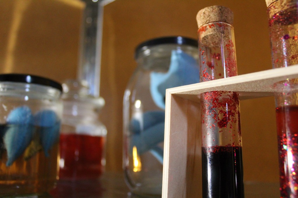 The last test I did for this project during this time was the ‘Bippy learning lab’, an immersive lab space with soundscape, photos and diagrams on the walls and faux specimens littering the room. I included some elements of interactivity including a white board with a marker and letter magnets which people interacted with happily, leaving little messages and jokes which added even more to what I already had. This project really sparked an interest in me to continue creating art with interactive elements and spaces that allow people to be creative and imaginative and have a good laugh.