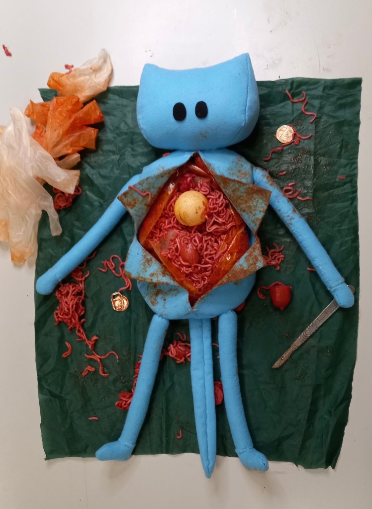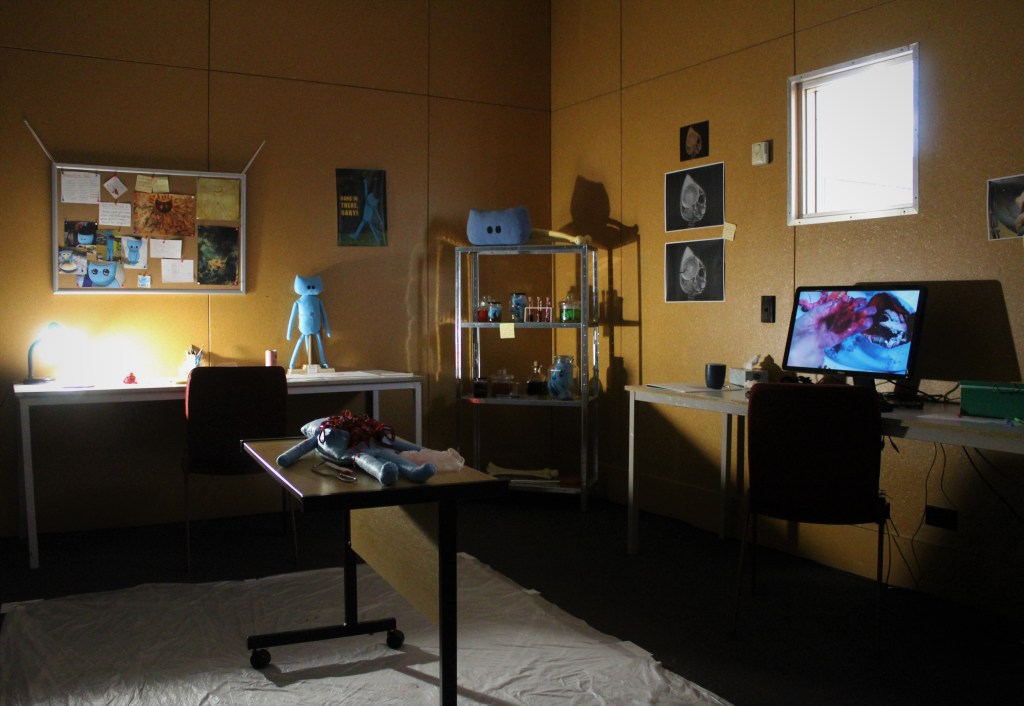For my final year project while studying at Toi Whakaari, I became very interested in horror comedy and how I could create a compelling live, immersive space that would be equal parts funny and creepy. This is when I created the Bippy character to serve as the anchor of my project. My first performance test consisted of an autopsy on a ‘dead’ Bippy and it seemed to successfully tie together my two ideas thanks to the shock horror of the grotesque insides that lay beneath my cute puppet. From there I continued to develop this project, performing more autopsies, making more puppets and gradually adding more and more details.