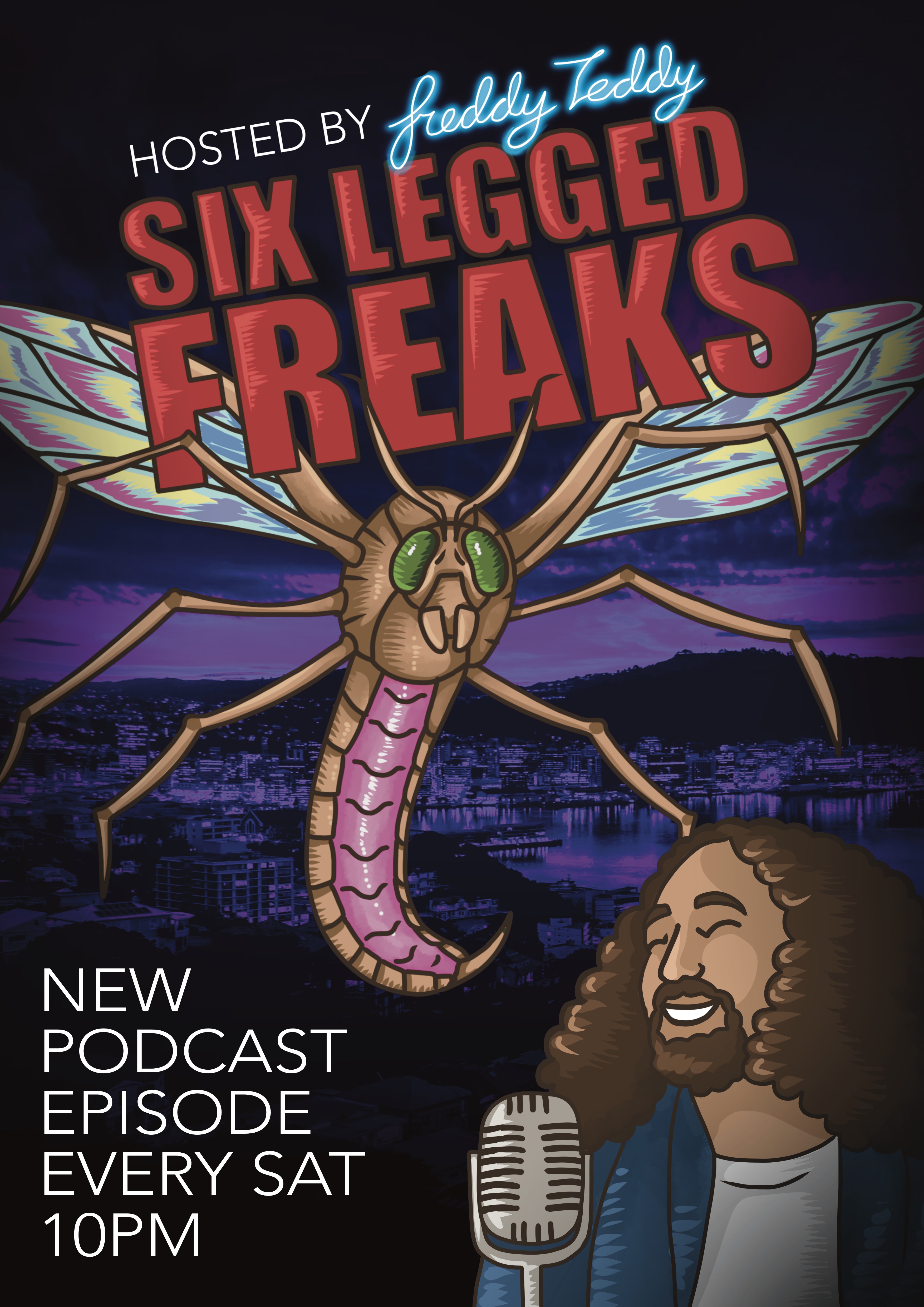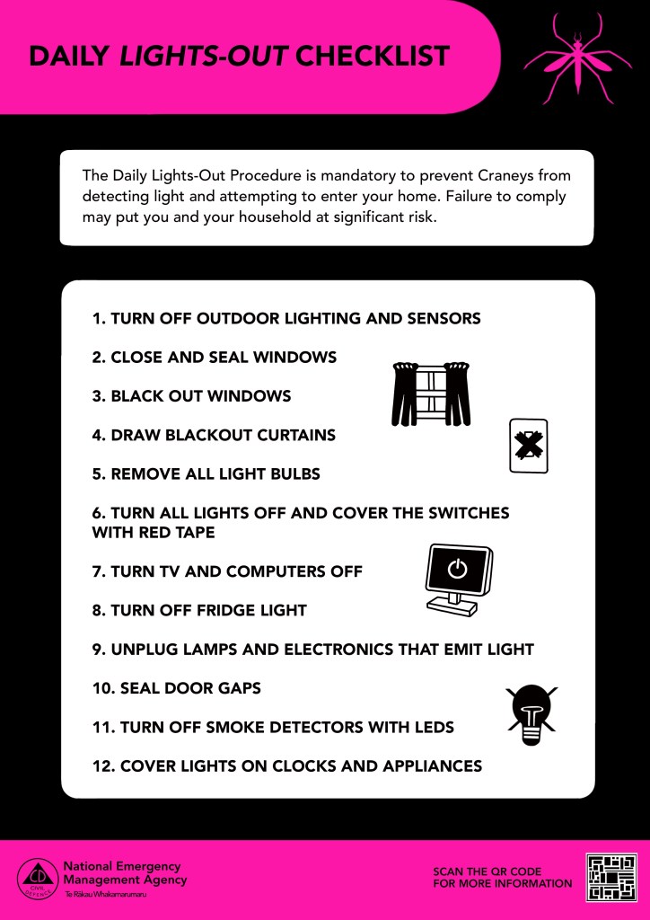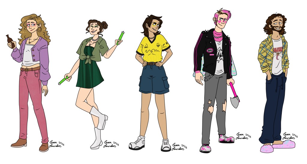 One of my biggest roles on a short film was for ‘Dance the Light Away’ created by Annabelle Snelling. The film follows a group of 20 somethings in a Wellington overrun by giant killer Crane flies and is intended to serve as a proof of concept for a feature length film. I was responsible for designing and making/sourcing the costumes for the 5 main characters but also came on later as graphic designer, creating assets such as the logo and posters for the film as well as in world graphics. The director’s aim was to create a fully realised world, one that felt fun and colourful and showcased Wellington and the talent within it.